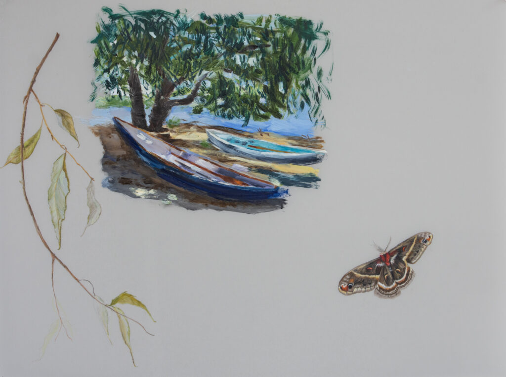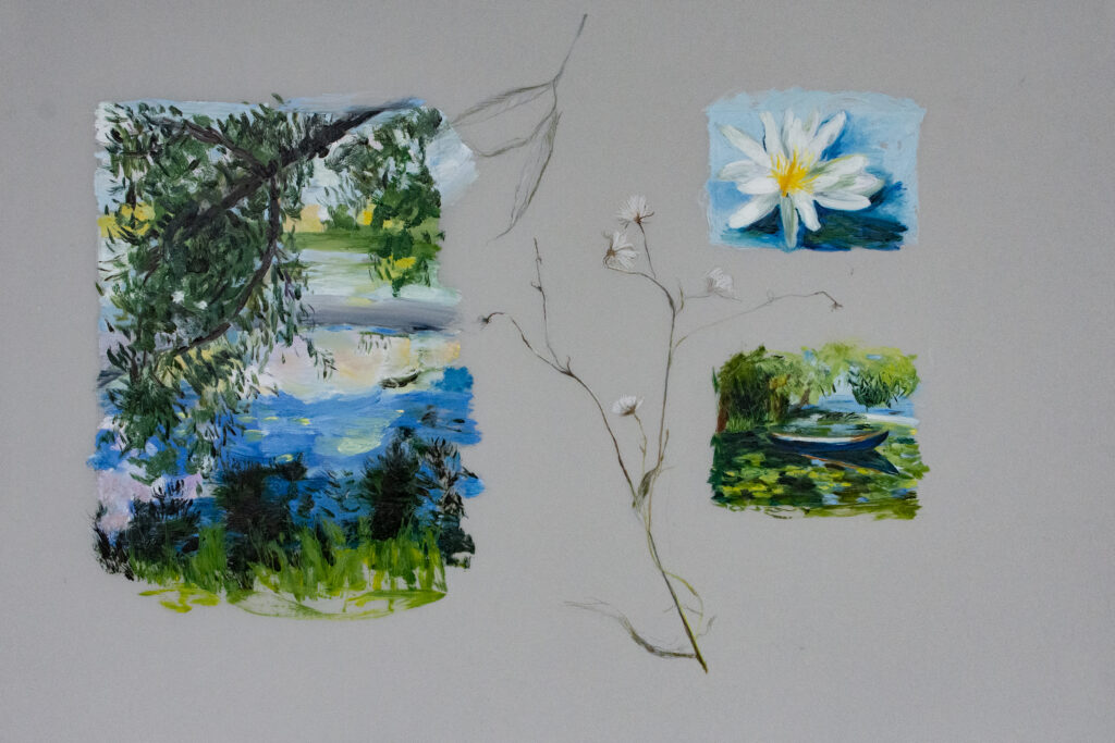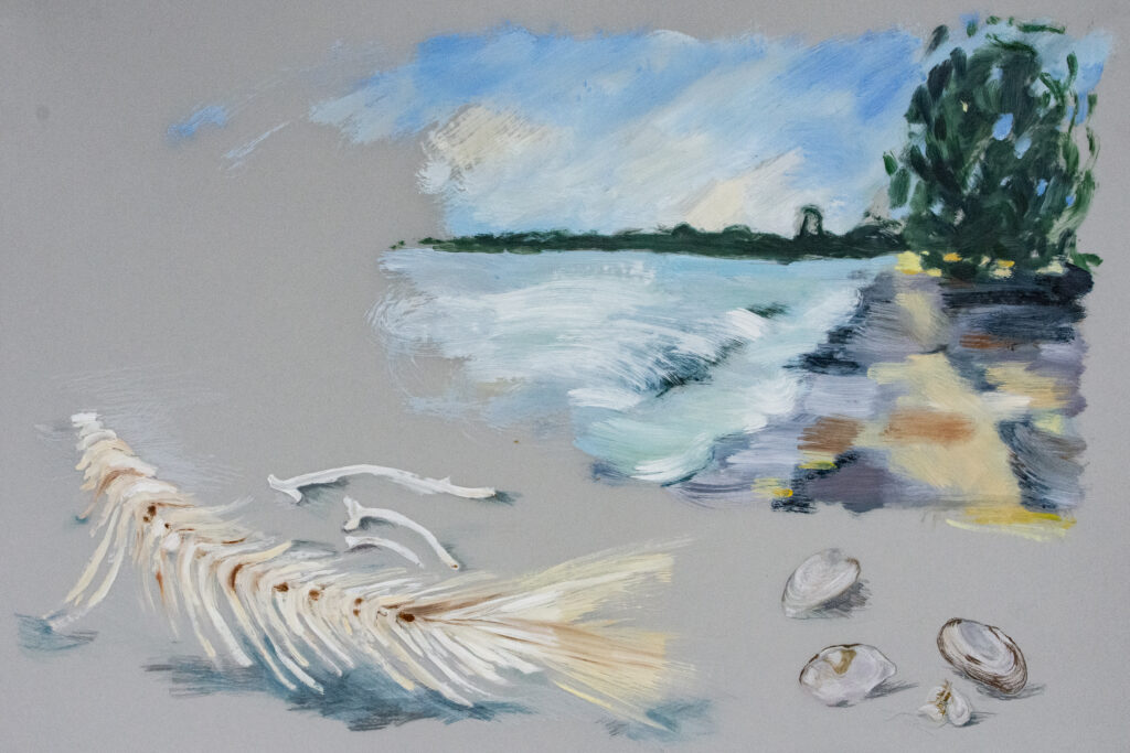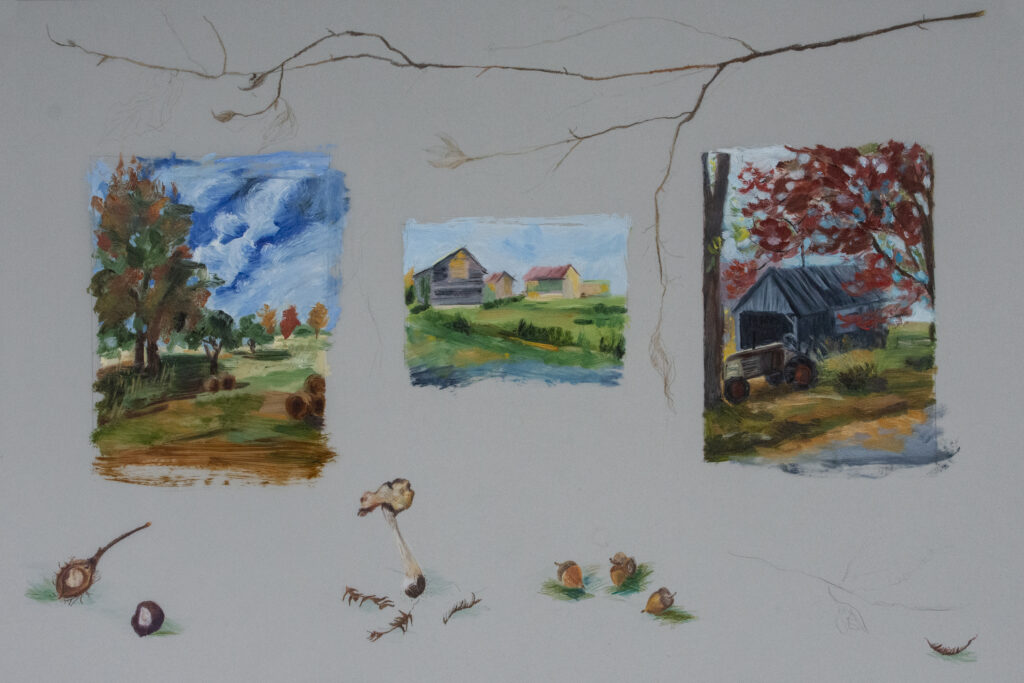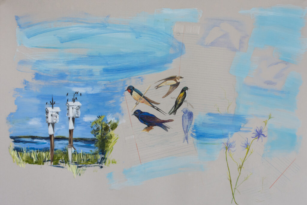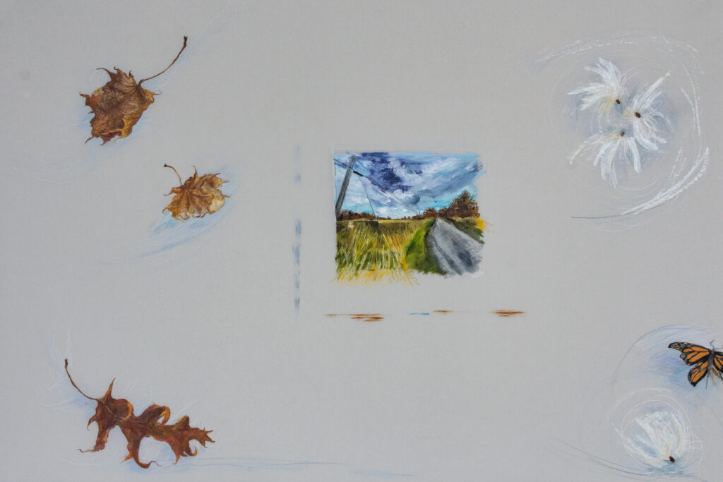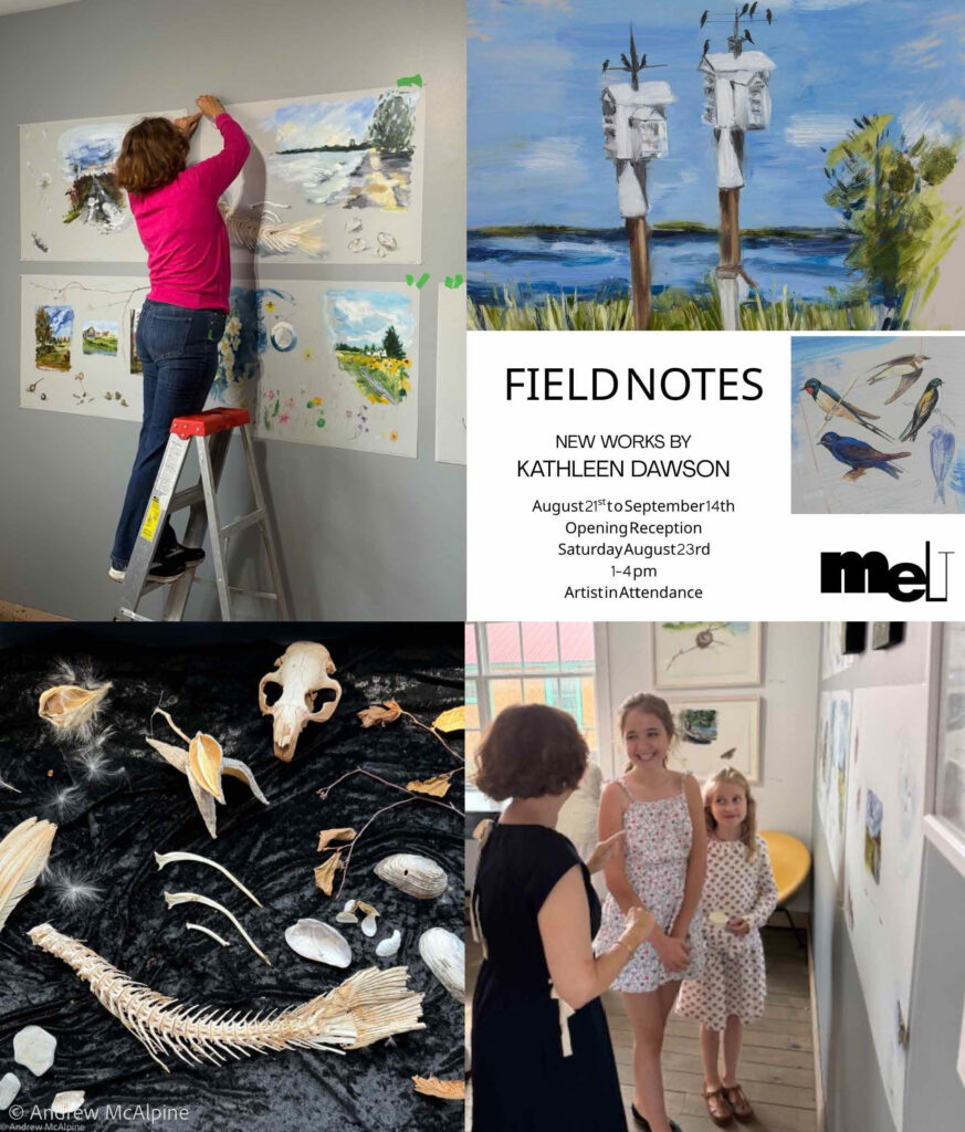 The Field Notes series explores the beautiful environment of Amherst Island, Ontario where Kathleen and her family spend summers. The work combines observational drawings of local natural specimens with painterly rural and lakeside landscapes in Kathleen’s own unique style of scientific field notes, completed on both wood panels and mylar.